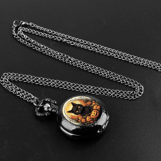 Montre à Gousset Halloween chat – Cadran Blanc, Capot Décoré